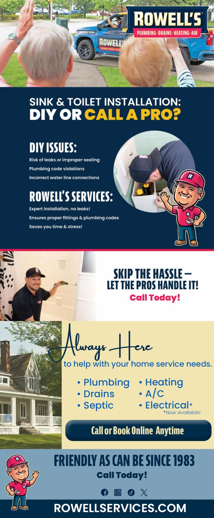 "Friendly As Can Be Since 1983!" When you need help with your plumbing, drains, heating, cooling or electrical in Ossipee, you can always rely on Rowell's Services! Call us now or book online!